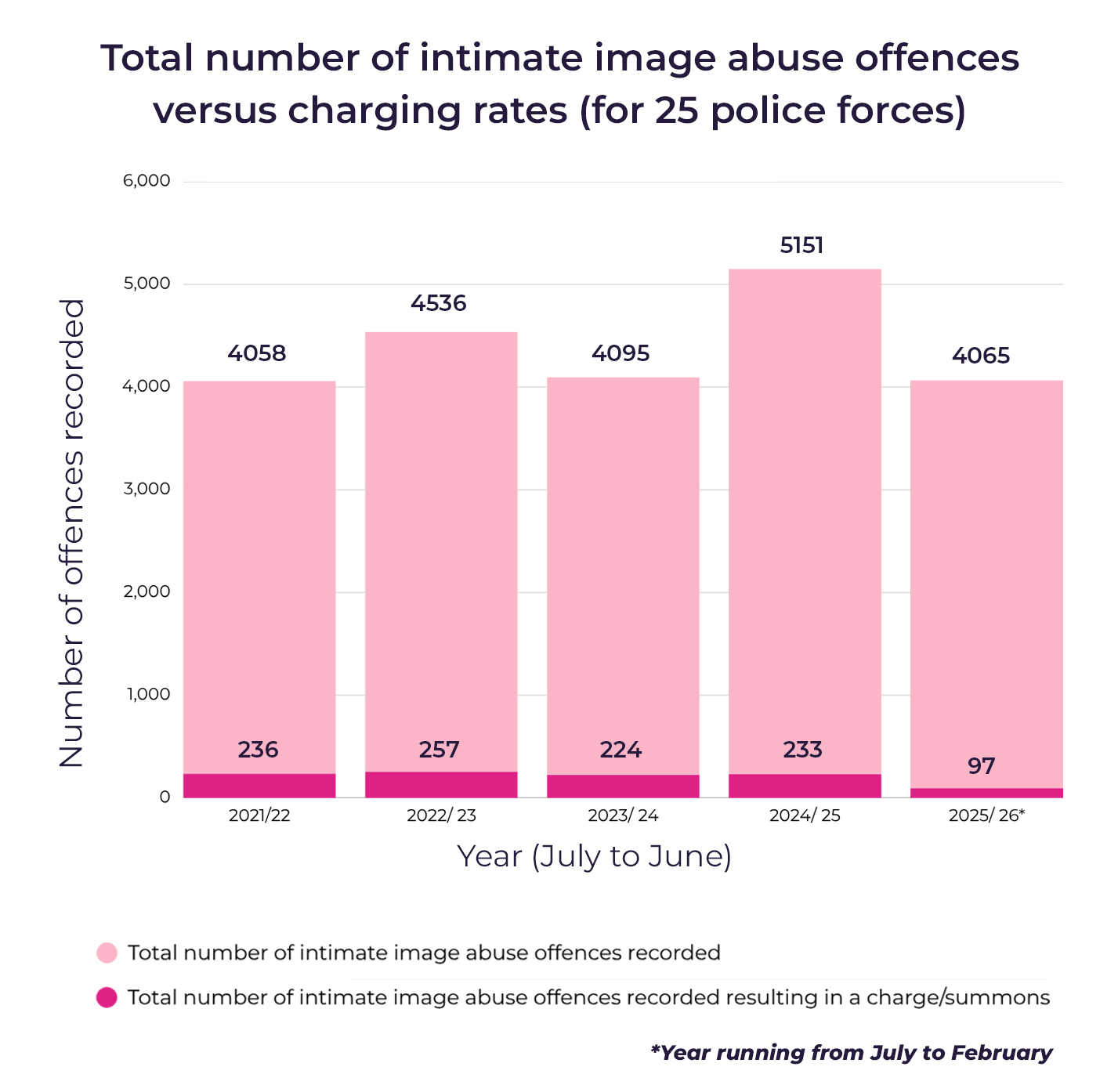 Between the year ending June 2022 and the year ending June 202511, recorded intimate image abuse offences rose by 26.9% overall among the 25 police forces that provided outcome data, rising from 4,058 offences in 2021/22 to 5,151 in 2024/25.12 This upward trend was particularly marked between the year ending June 2024 and June 2025, when recorded offences increased by 25.8%. Notably, between July 2025 and February 2026, there have already been more offences recorded (4,065) than in all of the year ending June 2022 (4,058). Whilst the increase indicates the continued prevalence of intimate image abuse, it could also suggest that the law is capturing intimate image abuse offences more accurately and that a growing number of survivors are coming forward to report to the police.