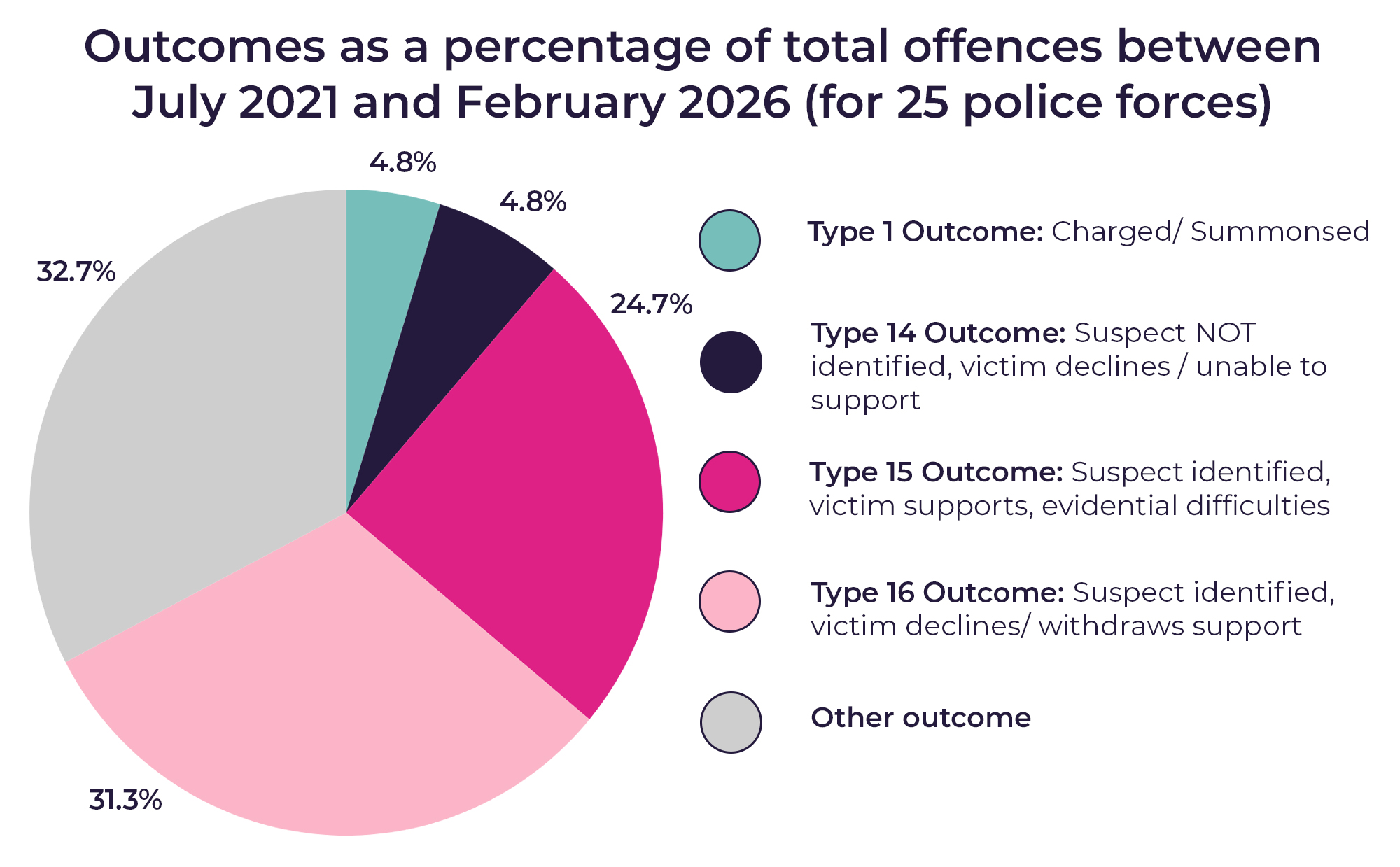 8 Charge / Summons: A person has been charged or summonsed for the crime; Outcome 14: Evidential difficulties victim based – named suspect not identified: The crime is confirmed but the victim declines or is unable to support further police action to identify the offender; Outcome 15: Evidential difficulties named suspect identified – the crime is confirmed, and the victim supports police action, but evidential difficulties prevent further action (this includes cases where the suspect has been identified, the victim supports action, the suspect has been circulated as wanted but cannot be traced and the crime is finalised pending further action); and Outcome 16: Evidential difficulties victim based – named suspect identified: The victim does not support (or has withdrawn support from) police action.