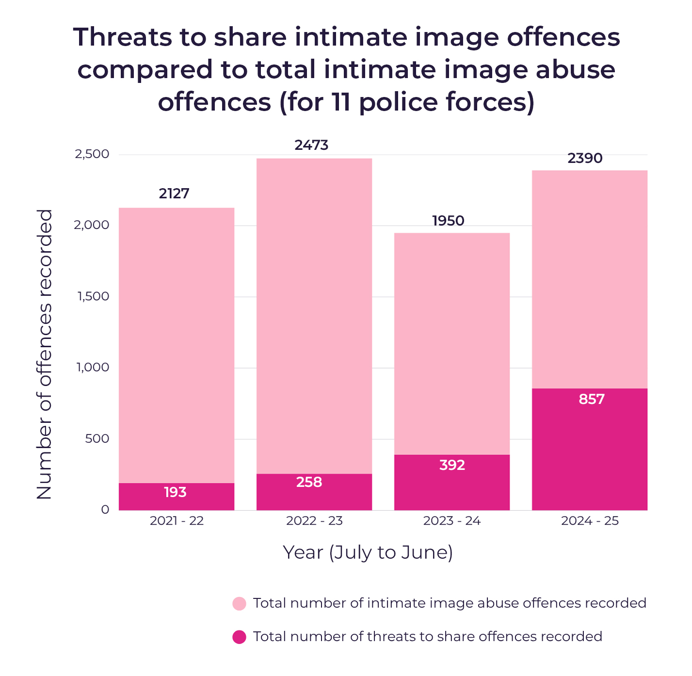 15 We have focused here on 2024/2025 as data for previous years was incomplete, most likely due to threats to share offences not being consistently captured in police data prior to a legislative change on the 31st of January 2024.